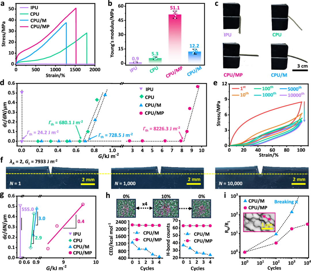 在抗變形能力測試中,CPU/MP表現出最優的硬度,可完全支撐自重而不發生彎曲。同時,其韌性達到405.9 MJ·m?³,為IPU的86.4倍。尤為值得注意的是,CPU/MP的疲勞閾值(Γth)高達8226.3 J·m?²,相當于IPU的339.9倍。即便在能量釋放速率達到7933.0 J·m?²的條件下,該材料經歷萬次循環拉伸后仍未觀察到裂紋擴展。