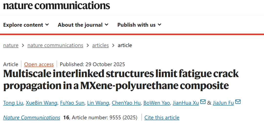 2025年10月29日,相關工作以“Multiscale interlinked structures limit fatigue crack propagation in a MXene-polyurethane composite”為題發表在《Nature Communications》。
