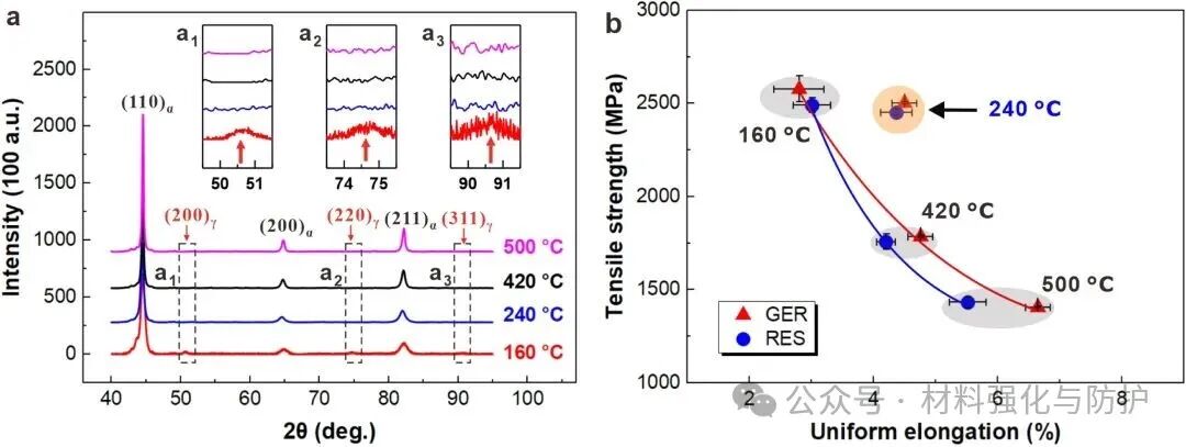 通過回火溫度的調控(160-500℃),團隊研究發現在240℃回火時鋼材內部保留的殘余奧氏體含量大幅減少,回火馬氏體與碳化物的協同作用提升了均勻延伸率,最終在RES-T240鋼中實現了1103MPa的疲勞強度,刷新了以往的紀錄。