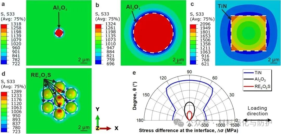 該研究以GCr15軸承鋼為研究對象,通過添加微量稀土元素提升夾雜物塑性,避免其脆性斷裂,同時構建了可剪切的夾雜物與基體界面結構,增強協同變形能力,并調整熱處理工藝,實現抗拉強度與塑性的協同優化和降低夾雜物處疲勞開裂風險。在應力比 R=-1 的拉壓載荷條件下,該GCr15軸承鋼在107循環下的疲勞極限達到1103MPa。研究通過有限元模擬,驗證了夾雜物的尺寸、類型等因素對應力集中的影響,所提出的技術策略依托現有工業技術即可實現,為其他高強度金屬材料疲勞性能的優化提供了切實可行的方案