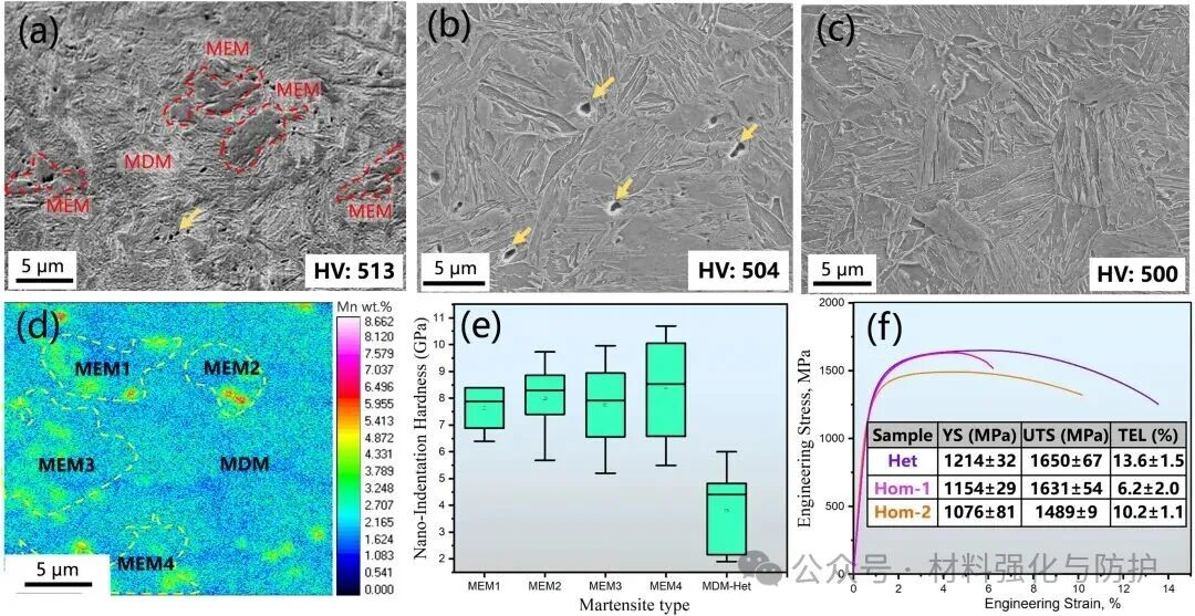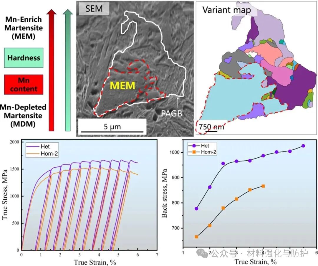 在Het樣品中觀察到兩種類型的馬氏體相:Mn貧化馬氏體(MDM)與Mn富集馬氏體(MEM),MDM具有多取向變體,而MEM則受限于單一取向變體,這種顯著的晶體學差異導致MDM/MEM界面處產生GNDs,相比之下,對照組顯示出均勻的馬氏體組織,沒有明顯的結構區別。
