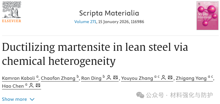 研究人員們不斷試圖開發更便捷的方法,近年來化學異質性在鋼中引入強-韌協同的潛力開始被人們發現,特別是錳元素的分布調控。但該方法究竟能否在不依賴殘余奧氏體的情況下,僅憑馬氏體內部的化學異質性就能夠實現強塑性的協同,這一點在之前的研究中還未明確闡明。清華大學與天津大學的聯合團隊于2025年9月15日在國際材料領域期刊《Scripta Materialia》在線發表的題為“Ductilizing martensite in lean steel via chemical heterogeneity”的研究論文給出了答案,該論文的通訊作者為天津大學丁然副教授和清華大學的張游游博士以及陳浩教授。