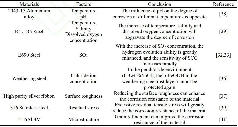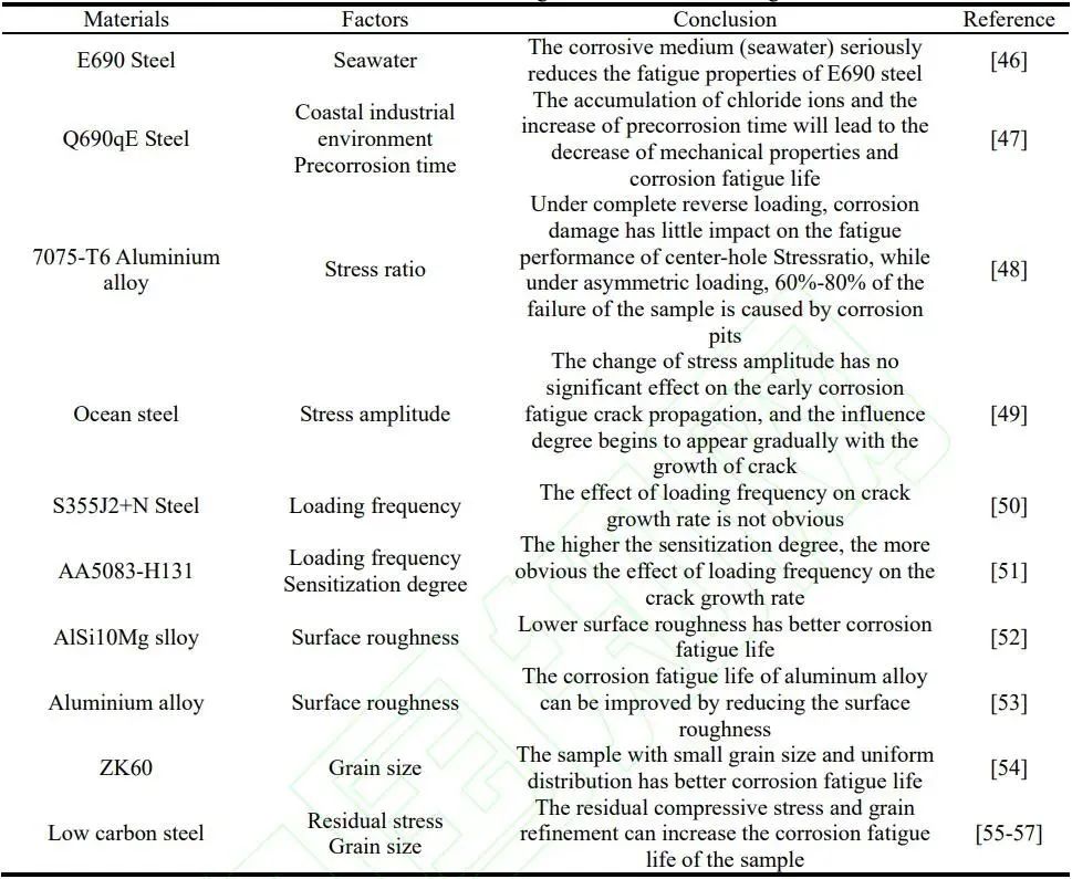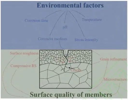 上述學(xué)者們的研究結(jié)論之間有看似相悖的情況,這是因?yàn)槭褂玫牟牧蟽?nèi) 部成分存在差異且不同構(gòu)件的處理參數(shù)和受力情況也大不相同。因此,當(dāng)前仍缺乏對(duì)提升構(gòu)件耐腐蝕性能 及腐蝕疲勞壽命的內(nèi)在機(jī)制的認(rèn)識(shí)。