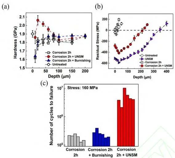 Zhang等采用超聲納米晶表面改性(UNSM)對(duì) 7075-T651預(yù)腐蝕鋁合金的疲勞性能進(jìn)行改善,研究結(jié)果表明對(duì)預(yù)腐蝕試樣表面進(jìn)行拋光和UNSM處理均可以提升預(yù)腐蝕試樣的疲勞壽命。如圖21(c)所示,拋光處理帶來(lái)的疲勞壽命增益有限,而UNSM處理可以使試樣疲勞壽命提高至原來(lái)的20倍,這是因?yàn)閽伖夂蚒NSM均可對(duì)腐蝕表面起到一定的修復(fù)作用。UNSM處理的效果如此顯著還要得益于高殘余壓應(yīng)力和硬度梯度的引入,如圖21a、21b所示。