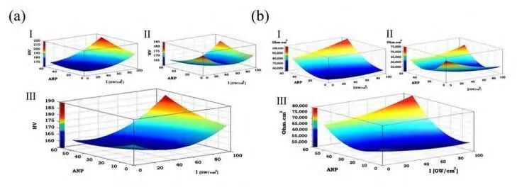 圖 11 不同激光能量密度、ANP 和光斑直徑(Ⅰ:2 mm;Ⅱ:0.3 mm;Ⅲ:1 mm)對(duì)(a)硬度(b)電化學(xué)腐蝕性能的影響