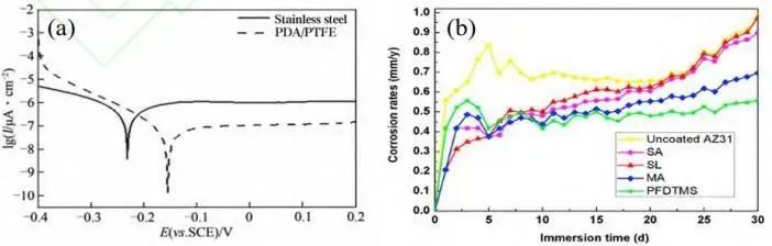 圖 8 (a) 在3.5 wt%NaCl 水溶液中不銹鋼和 PDA/PTFE涂層樣品的極化曲線;(b) 未涂覆的 AZ31和改性膜的腐蝕速率隨時(shí)間的變化曲線