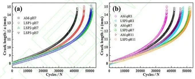 Wang等得出了不同激光能量處理后的 AISI 420不銹鋼在不同pH環(huán)境下(腐蝕環(huán)境為 0.598 mol/L的NaCl溶液)的裂紋長(zhǎng)度(a)和疲勞壽命(N)的對(duì)應(yīng)關(guān)系。圖16為實(shí)驗(yàn)分組。圖 17為a-N曲線,其中如圖17a所示,與原始試樣(AM)相比,所有大規(guī)模激光沖擊試樣(MLSPTed)的腐蝕疲勞壽命均有所提升, LSP1、LSP2和LSP3的腐蝕疲勞壽命分別提高了 20.82%、30.87%和29.28%,其中LSP1、LSP2和LSP3分別代表經(jīng)5.6 J、7.6J和梯度能量(7.6J-5.6J-3.6J)激光沖擊處理的試樣。這表明激光沖擊處理可以有效 抑制裂紋的萌生和擴(kuò)展,延長(zhǎng)試樣腐蝕疲勞壽命;圖 17b展示了AM和LSP2試樣在NaCl溶液中的a-N曲線隨pH值的變化規(guī)律,在同一激光沖擊能量下,試樣的腐蝕疲勞壽命隨pH值的降低而減少。這是因?yàn)閜H值的降低會(huì)導(dǎo)致H+濃度升高從而破壞金屬試樣表面的鈍化膜,促進(jìn)滑移帶的溶解,從而使裂紋擴(kuò)展速率加快,降低試樣的腐蝕疲勞壽命。