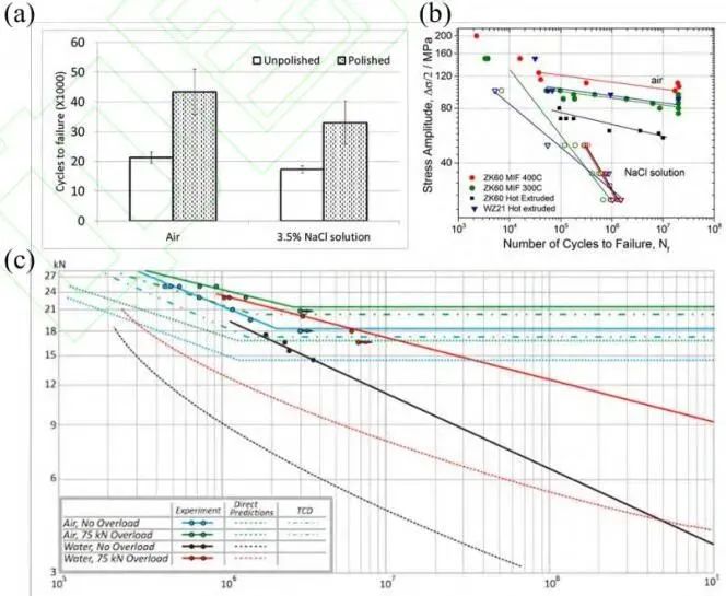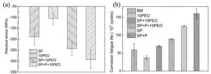 Ye等研究了噴丸(SP)和等離子體電解氧化(PEO)復(fù)合處理對(duì)7A85鋁合金的腐蝕疲勞壽命。如圖9b 所示,只進(jìn)行PEO處理會(huì)降低原始試樣的腐蝕疲勞壽命,這是因?yàn)殚]塞電池促進(jìn)了局部腐蝕;在PEO處理前進(jìn)行SP處理可以提高原始試樣的腐蝕疲勞壽命,在兩者間加入拋光處理(P)則可以進(jìn)一步提高試樣腐蝕疲勞壽命;這是因?yàn)镾P引入的殘余壓應(yīng)力可以抑制晶間腐蝕,拋光則可以降低SP后帶來(lái)的表面粗糙度的增加。圖9a則展示了部分試樣的表面殘余壓應(yīng)力,結(jié)合圖9b可以發(fā)現(xiàn)殘余壓應(yīng)力高的實(shí)驗(yàn)分組其腐蝕疲勞壽命也高(SP組除外),出現(xiàn)這種情況是因?yàn)镻EO涂層引入了較大的表面粗糙度從而導(dǎo)致局部應(yīng)力集中,反而降低了腐蝕疲勞壽命。