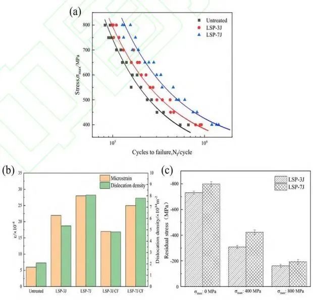 Ma等研究了不同激光能量對(duì)300M鋼腐蝕疲勞壽命的影響。如圖15a所示,在同一加載應(yīng)力水平下,經(jīng)LSP處理的試樣的腐蝕疲勞壽命有明顯提升,且這種提升隨著激光能量的增加而增加。這是因?yàn)長(zhǎng)SP在試樣表面帶來(lái)了較高的殘余壓應(yīng)力,且在試樣次表層形成變形孿晶并提高了位錯(cuò)密度,進(jìn)一步提高 了試樣的腐蝕疲勞壽命,如圖15b、15c所示。此外,圖 15b、15c還展示了腐蝕疲勞過(guò)程中位錯(cuò)、微變形的減小和殘余壓應(yīng)力的松弛現(xiàn)象,這是因?yàn)槠谶^(guò)程中位錯(cuò)的持續(xù)運(yùn)動(dòng)會(huì)導(dǎo)致原有位錯(cuò)的湮滅,進(jìn)而導(dǎo)致 變形能的逐漸釋放和殘余壓應(yīng)力的松弛。從圖中還可看出經(jīng)較高激光能量(7J)處理的試樣表面的微變形、位錯(cuò)密度和殘余壓應(yīng)力更加穩(wěn)定,能夠更有效地抑制疲勞裂紋擴(kuò)展從而擁有更高的腐蝕疲勞壽命。
