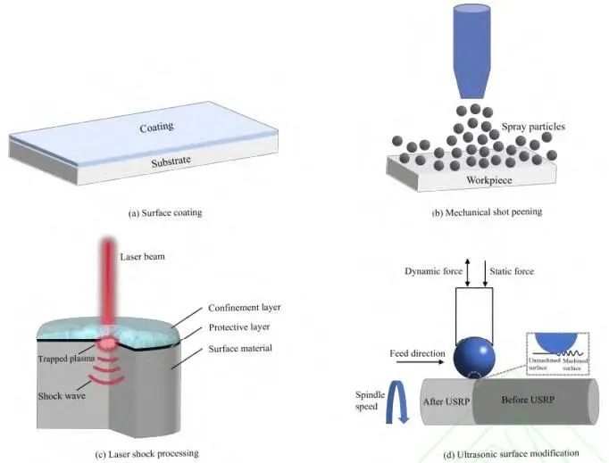 金屬材料的腐蝕疲勞行為在很大程度上取決于其表面的微觀結(jié)構(gòu)特征和力學(xué)性能。針對(duì)上文提到的影響因素,學(xué)者們研究了不同表面改性手段對(duì)海洋環(huán)境下金屬構(gòu)件腐蝕損傷和腐蝕疲勞性能的影響,圖7展示了目前常見的4種改性手段。本節(jié)主要從這幾種表面改性技術(shù)入手總結(jié)表面改性技術(shù)對(duì)腐蝕損傷與腐蝕疲勞性能改善的研究現(xiàn)狀。