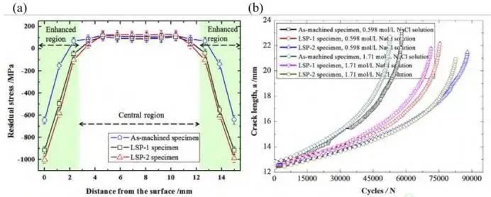 Luo 等研究了不同覆蓋層數(shù)的激光沖擊強(qiáng)化對(duì)Fe-Cr合金試樣在NaCl溶液中的腐蝕疲勞行為。如圖14a所示,覆蓋層數(shù)的增加可以提高殘余壓應(yīng)力,LSP處理引入的殘余壓應(yīng)力場(chǎng)可以有效提升試樣的腐蝕疲勞壽命;如圖14b所示,相同NaCl溶液濃度下,激光沖擊覆蓋層數(shù)多的實(shí)驗(yàn)組表現(xiàn)出了較好的腐蝕疲勞壽命。