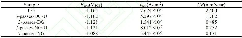 從上述描述可以發(fā)現(xiàn),較高的殘余壓應(yīng)力和較低的表面粗糙度會(huì)改 善試樣的耐腐蝕性能,但這一結(jié)論并不絕對(duì),如3-passes-DG 組試樣的殘余壓應(yīng)力為第二大且表面粗糙度最低,然而其耐腐蝕性能不及7-passes-NG-U組試樣。這是因?yàn)楫?dāng)晶粒尺寸細(xì)化到納米級(jí)別時(shí),由于存在大量納米級(jí)晶粒和晶界,這會(huì)引起大量惰性元素富集在晶界從而形成致密的鈍化膜阻礙腐蝕行為的進(jìn)行。