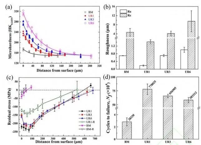 Xu等研究了不同超聲滾壓沖擊次數(shù)對(duì) 7B50-T7751鋁合金腐蝕疲勞性能的影響。如圖19d所示,超聲滾壓能提高7B50-T7751鋁合金試樣的腐蝕疲勞壽命,這是因?yàn)槌暆L壓后,細(xì)化了試樣表面微觀組織、形成了高殘余壓應(yīng)力場(chǎng)和顯微硬度場(chǎng)的梯度改性層,如圖19a、19c所示;而UR1(滾壓一次)組有最高的腐蝕疲勞壽命,這是因?yàn)橄噍^滾壓3次和6次的試樣其表面粗糙度較低。由此我們需要注意表面完整性對(duì)試樣腐蝕疲勞壽命的影響,因?yàn)闈L壓次數(shù)過(guò)多可能會(huì)造成表面損傷,利于疲勞裂紋的萌生,從而降低腐蝕疲勞壽命。