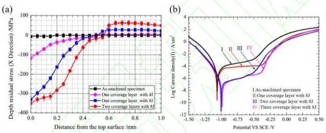 圖 12 不同處理參數(shù)下 AISI 4145 鋼(a)沿深度方向殘余應(yīng)力分布(b)在 0.598 mol/L NaCl 溶液中浸泡后的電位 動(dòng)極化曲線:(Ⅰ)機(jī)加工試樣,(Ⅱ) 1 層 8 J 覆蓋層,(Ⅲ) 2 層 8 J 覆蓋層,(Ⅳ) 3 層 8 J 覆蓋層