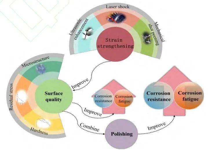 綜上所述,表面涂層可改善構(gòu)件的耐腐蝕性能,但對(duì)腐蝕疲勞壽命卻提升有限,應(yīng)變改性技術(shù)通過(guò)引入殘余壓應(yīng)力、改變?cè)嚇颖韺拥奈⒂^結(jié)構(gòu)和力學(xué)性能能同時(shí)提高耐腐蝕性能和腐蝕疲勞壽命,其中腐蝕疲勞壽命提升較為明顯。三種應(yīng)變改性也各有特點(diǎn)可以結(jié)合實(shí)際情況進(jìn)行選擇,如機(jī)械噴丸工藝成熟、成本較低;激光沖擊殘余壓應(yīng)力影響層深(最大可達(dá)幾毫米)、工藝參數(shù)可精準(zhǔn)控制;超聲沖擊對(duì)表面粗糙度影響小、設(shè)備便攜。如圖22所示,通過(guò)對(duì)試樣表面進(jìn)行高能沖擊,使其產(chǎn)生塑性變形、引入高殘余壓應(yīng)力、誘導(dǎo)晶粒組織產(chǎn)生位錯(cuò)和孿晶,提高試樣表面質(zhì)量。這些表層微觀結(jié)構(gòu)的變化可以抑制腐蝕離子對(duì)試樣表面及內(nèi)部的侵蝕,提高耐腐蝕性能,同時(shí)高殘余壓應(yīng)力能有效抵御外加載荷從而提升試樣的疲勞壽命。相關(guān)研究還表明應(yīng)變改性技術(shù)與拋光相結(jié)合可以進(jìn)一步提升試樣的耐腐蝕性和腐蝕疲勞性能。