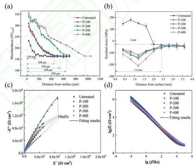 圖 20 車削和超聲滾壓試樣的(a)顯微硬度(b)殘余應(yīng)力(c) Nyquist 曲線(d) Bode曲線