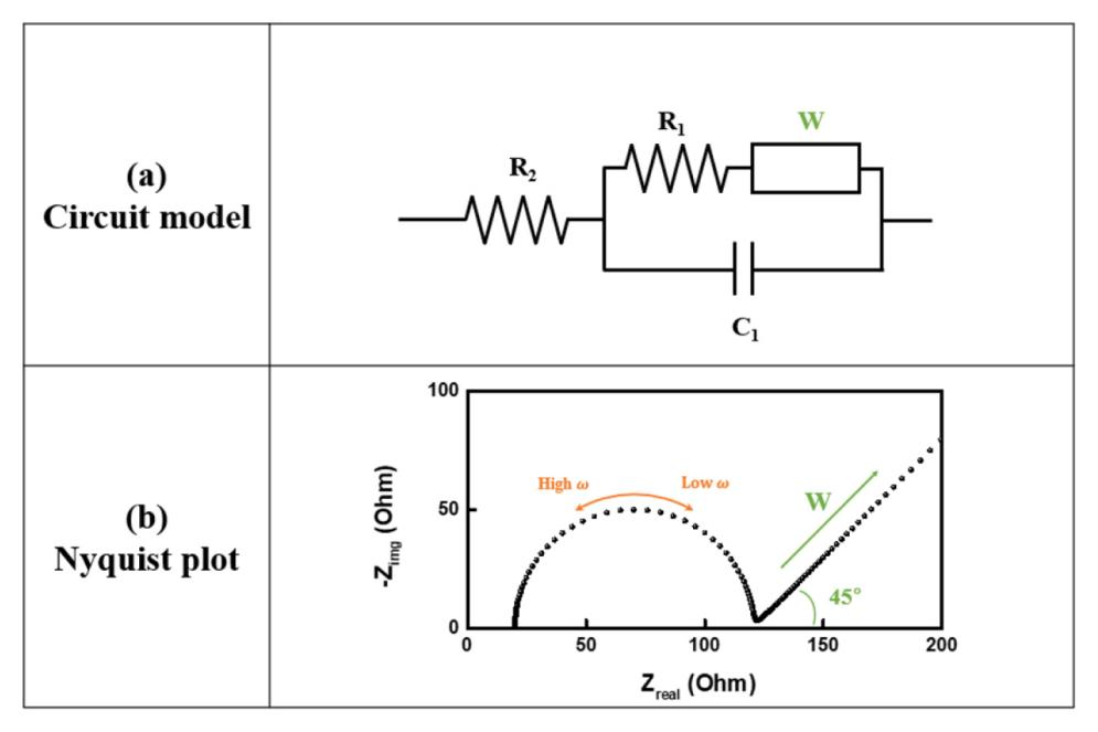 該電池的電路模型和Nyquist圖如圖所示。在Nyquist圖中,Warburg阻抗在半無限條件下表現(xiàn)為一條斜率為45°的直線,以及僅由一側(cè)大平面電極限制的一維擴(kuò)散,在這種情況下,Warburg系數(shù)σ為1 Ω·s-1/2。