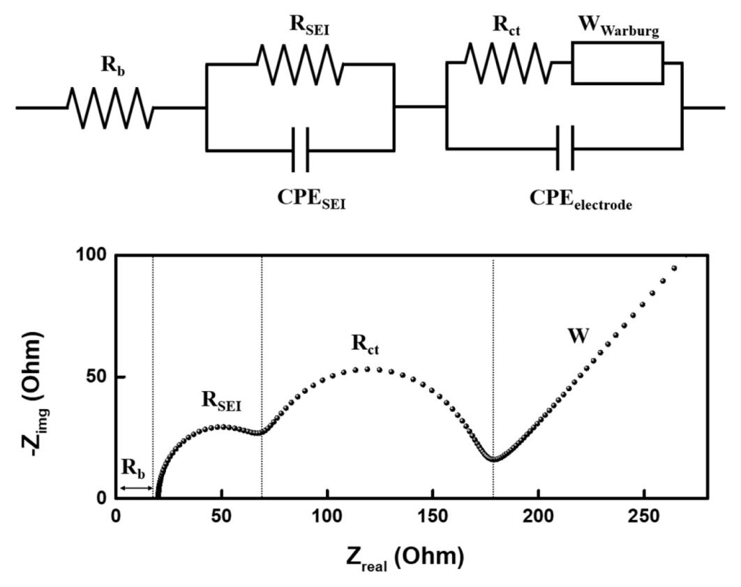 圖9:鋰離子電池半電池系統(tǒng)的等效電路模型。Rb:電池的體電阻(電解質(zhì)、隔膜和電極);RSEI、CPESEI:界面層的電阻和電容;Rct、CPEele:電荷轉(zhuǎn)移電阻和雙電層電容;W:鋰離子在主體材料上的擴(kuò)散效應(yīng)。
