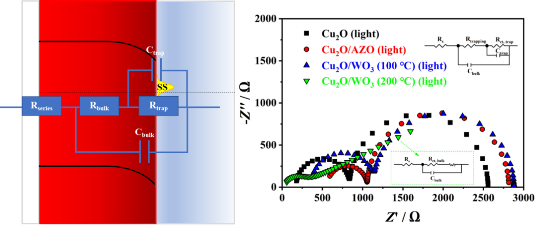 而表面態(tài)的作用大多被忽視了,導(dǎo)致無法明確擬合和解釋阻抗譜與電化學(xué)體系之間的關(guān)系。因此,為了進(jìn)一步闡明表面態(tài)的作用,采用了下圖并聯(lián)等效電路模型,其中材料體相和表面態(tài)的電阻和電容分別用Rbulk、Cbulk和Rtrap、Ctrap表示。