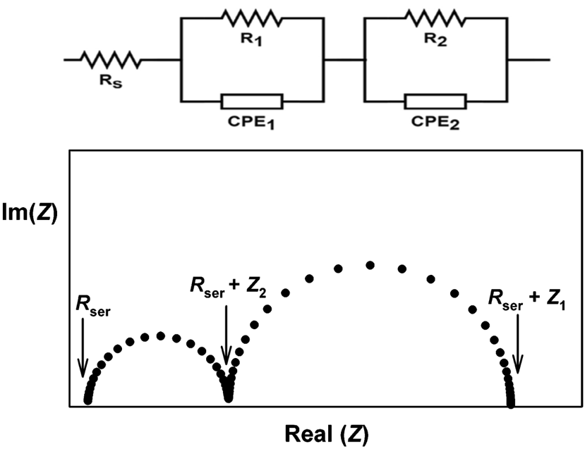 當(dāng)Nyquist圖顯示出兩個(gè)半圓時(shí),表明系統(tǒng)中存在兩個(gè)時(shí)間常數(shù)。每個(gè)半圓對(duì)應(yīng)于等效電路模型中的R-C(或R-CPE)電路之一。每個(gè)半圓的直徑與相應(yīng)R-C(或R-CPE)電路中的電阻有關(guān)。