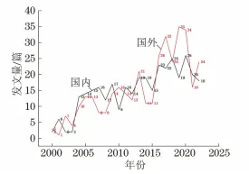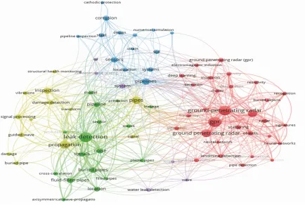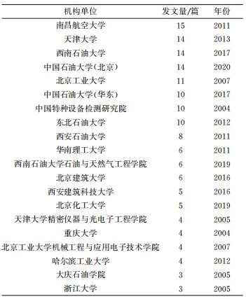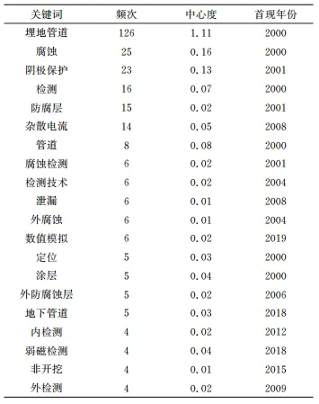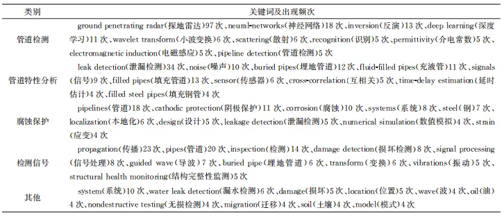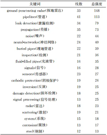 埋地管道運輸作為一種具有良好經濟性、快捷性和可靠性的運輸方式,近年來得到快速發展。據統計,發達國家三分之二以上的油氣均是通過埋地管道進行運輸的,隨著我國西部大開發戰略的推進以及“一帶一路”倡議的實施,管道運輸行業的規模也得到了飛速提升。2023年5月,在陜西省西安市舉行的中國-中亞峰會為“一帶一路”注入了新動力,也為埋地管道的發展輸送了新活力。因此,系統全面地了解我國在埋地管道及其檢測領域的研究現狀、把握和指導研究態勢和方向,對該領域的研究開展綜合系統的分析具有很大的必要性。 知識圖譜(MKD) 分析是一種借助現代計算信息技術開展的信息文本挖掘分析手段,已廣泛應用在文獻信息收集與分析方面。利用知識圖譜可以通過聚類和共現等方式具體形象地展示某個科學研究領域的核心結構、研究熱點以及作者機構等關鍵信息和隱含關系。伍其兵等將知識圖譜分析應用于摻氫天然氣管道領域的研究分析中,梳理了國內外研究現狀并對未來演進趨勢進行了預測;吳張中將科學知識分析應用于油氣管道地質災害風險管理中,為管道地質災害風險評價及防治的智能輔助決策提供了可行路徑。 綜上,筆者采用成熟的信息可視化軟件CITESPACE和VOSVIEWER進行優勢互補,對國內外埋地管道領域的研究文獻開展知識圖譜分析,系統揭示該領域的研究現狀與發展趨勢。通過對比分析國內外研究的差異與特色,進一步預測國內未來研究方向,并提出創新性研究建議。研究成果對埋地管道及相關領域的工程實踐具有重要參考價值。 1 數據來源與發文量分析 國內研究中以中國知網(CNKI) 作為數據的來源,為了確保數據的全面性和前沿性,檢索時間設置為2000年1月至2022年12月。同時為了使研究更具代表性和準確性,選取中文核心期刊、EI期刊等高水平具有代表性的文獻,再對檢索到的文獻進行去重等優化整理后得到有效文獻樣本334篇。國外研究中樣本文獻數據來源于國外收錄范圍最全面、最廣泛的Web ofScience文獻收錄庫,并選擇Web of Science核心合集,檢索2000至2023年間關于埋地管道及其檢測防護領域的英文文獻,將檢索到的文獻進行篩選和剔除,最終得到370篇有效文獻。 為了更加直觀地了解和觀察埋地管道相關文獻產出和發展情況,將選取的國內外相關文獻進行年限產出情況分析,制成2000-2022年的文獻時序圖,如圖1所示。 圖1 發文量時間圖譜 通過分析2001-2023年國內外埋地管道研究領域的發文量,提出以下兩個主要發現: (1) 國內外發文量自2000年來均為增長趨勢,總體上分為三個階段。第一階段(2000至 2005年) 為緩慢發展階段, 國內外年均發文量均為十篇以內,相關領域的研究還處于萌芽階段。第二階段(2005至2015年) 為快速發展階段,年均發文量呈波動式上升,整體增長穩定,埋地管道領域的研究較為火熱,具有良好的研究熱度。第三階段(2015年至今) 為穩定發展階段,國內外發文量保持較高的穩定狀態,說明經過第一、二階段的發展,經過理論和實踐的積累和沉淀,埋地管道研究領域的行業體系已初步建成,相關研究已相對成熟。 (2) 在第三階段(2015年至今),雖然國內外的發文量均為增長狀態,但是國外的發文量明顯多于國內,導致這種現象與不同國家埋地管道發展差異有關。但也說明未來我國在該領域的研究仍具有很大的發掘空間,尤其是在我國“一帶一路”等國家戰略的推進下,未來國內研究需進一步聚焦該領域。 2 國內外關鍵詞共現、聚類分析 共現、聚類分析是構建知識圖譜中最常見的方式。共現分析是一種文獻計量方法,通過量化分析文獻中作者、關鍵詞、機構等特征信息的共同出現頻率,構建可視化知識圖譜,揭示這些要素間的關聯性及其潛在規律。聚類分析是基于共現分析的特征分類方法,通過度量特征項間的關聯強度,將密切相關的特征聚合為不同簇團,并以知識圖譜形式可視化呈現分析結果。 2. 1 國內外關鍵詞共現、聚類圖譜 為了分析國內外埋地管道在管道相關研究文獻中出現的頻次,探究埋地管道的發展歷程,分別在CNKI和Web of Science文獻收錄庫中以“油氣管道”作為主題進行搜索,同時設置相應的文獻出版時間段。在此基礎上,再以“埋地管道”作為主題詞在檢索結果中進行搜索,對所得文獻進行篩選處理后,留下具有代表性的高質量文獻,得到不同時間段埋地管道在整個管道領域研究中的研究文獻占比和發展情況,如表1所示。 由表1可見,國內外關于油氣管道領域的研究文獻量整體呈大幅上漲趨勢,其中涉及埋地管道的文獻也呈增長趨勢,且國內的增加量和占比大于國外。 表 1 國內外“油氣管道”和“埋地管道”發文量情況 為了進一步對埋地管道領域的相關研究進行分析,運用Citespace軟件對CNKI中的334篇相關文獻進行關鍵詞共現分析,設置關鍵詞出現的最小次數為3次,并對關鍵詞數據進行清洗和去重處理,最后得到由297個關鍵詞和691條節點連線共同組成 的關鍵詞共現圖譜,網絡密度為0. 0134,如圖2所示。圖中每個圓圈節點代表一個關鍵詞,由共現圖譜可見,在埋地管道研究領域,陰極保護、腐蝕、檢 測、防腐層以及數值模擬等為高頻關鍵詞,視為研究領域中的重點和熱點,占主導地位。 圖2 國內關鍵詞共現圖譜 為了探索研究不同關鍵詞之間的聯系,在關鍵詞共現圖譜的基礎上對其進行聚類,得到關鍵詞聚類圖譜,對聚類后的不同領域進