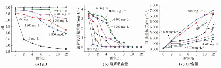 施加0.4V電壓,在0.5%(NH4)2SO4、3550mg/LCl-條件下,考察不同初始F-含量條件下閉塞電池模擬裝置試驗過程中閉塞區pH、溶解氧含量和Cl-含量的變化,結果如圖3所示,試驗結束后測量計算閉塞區F-含量的變化量與內電極的腐蝕速率,結果如表5所示。