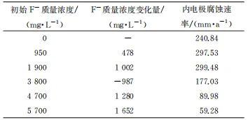 由表5可見:隨著初始F-含量的增加,內電極的腐蝕速率逐漸增大,并在初始F-質量濃度為3800mg/L時達到最大,隨著初始F-含量的繼續增大,腐蝕速率逐漸減小;隨著初始F-含量的增加,閉塞區F-含量整體呈增加趨勢,但在初始F-質量濃度為3800mg/L時,試驗前后閉塞區F-含量變化量為負數。這可能是由于此時進入閉塞區的F-量不大,閉塞區內原有的F-參與到氟化物的生成而被消耗,因此會出現含量變化量為負數的現象。繼續增大初始F-含量,F-含量變化量又恢復為正數,此時閉塞區F-含量超過了生成氟化物所消耗的F-量。