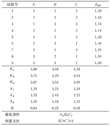影響不銹鋼局部腐蝕閉塞電池自催化反應速率的因素較多,本試驗選擇閉塞電池模型內溶液體積與陽極面積比(因素A,mL/cm2) 、陰陽極面積比 (因素B) 、模擬銹層厚度(因素C,mm) 這三個主要因素進行探討,分別模擬實際局部腐蝕萌生后空穴的形狀與大小、局部腐蝕閉塞電池形狀及電流影響范圍、局部腐蝕銹層封口物的組成及緊密程度。按照L9(34)設計正交試驗,系統考察上述三因素不同水平下陽極腐蝕速率及閉塞區溶液pH(隨自催化反應進程),通過極差分析確定顯著性影響因素,并據此優化閉塞電池模型的最佳參數組合,從而構建閉塞電池自催化反應研究模型。根據課題組前期 對氨法脫硫系統局部腐蝕研究結果設計各因素的水平,如表2所示。結合實際試驗情況,在考察內溶液體積與陽極面積比時,固定內溶液體積為110mL,根據比例計算對應的陽極面積,經線切割加工后使用;在考察陰陽極面積比時,固定陽極面積為1.6cm2,計算陰極面積。所有試驗均進行平行試驗。