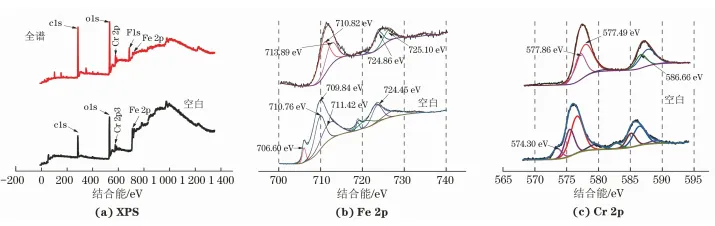為進一步探討F-含量對430不銹鋼局部腐蝕發展的影響,選取在初始F-質量濃度為5700mg/L下經電化學試驗后的內電極(以下簡稱腐蝕試樣) 與空白試樣進行XPS全譜圖和精細譜圖分析,結果如圖4所示。
