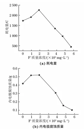 由圖2可見:隨著初始F-含量的增加, 系統耗電量、內電極腐蝕質量均呈現增大的趨勢,并在初始F-質量濃度為1900mg/L時均達到最大;當初始F-質量濃度高于1900mg/L時,隨著初始F-含量的增加,系統耗電量與內電極腐蝕量均減小,對腐蝕表現出一定的抑制作用。