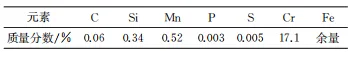 試驗用430不銹鋼試片購自揚州科力環保設備有限公司,其化學成分如表1所示。試片原始尺寸為100mm×50mm×2mm,經線切割加工成試驗所需大小。試驗前,使用不同型號的砂紙打磨試樣表面至光滑,再依次用去離子水、無水酒精和丙酮沖洗,最后將試樣表面擦拭干凈后用濾紙包裹置于干燥器中備用。