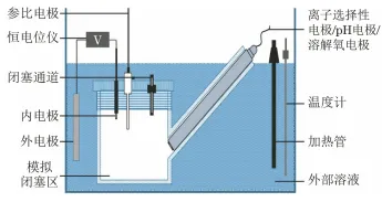 搭建如圖1所示的閉塞電池模型試驗裝置,用于模擬金屬局部腐蝕發展階段的研究。其中模擬閉塞區體積為110mL,將其浸在10L的外部溶液池內,其材料均為有機玻璃。在模擬閉塞區頂部開孔插入內電極(模擬金屬局部腐蝕過程中閉塞電池陽極區的工作電極,為430不銹鋼試樣) 、參比電極(飽和甘汞電極SCE) 并留有閉塞通道,閉塞通道用模擬銹層進行填充,模擬銹層由快速濾紙負載混氧化鐵[65%(質量分數,下同) Fe2O3+25%Fe3O4 +10%Fe(OH)3]制作而成。模擬閉塞區側面設有與底部成45°角的斜插管,根據試驗需要裝入在線pH電極、離子選擇性電極和溶解氧電極,實時監測模擬閉塞區內各參數的變化。工作電極(內電極)和對電極(外電極)均為430不銹鋼,分別模擬腐蝕陽極和陰極。試驗前后均按照化學清洗法對電極試樣進行處理。