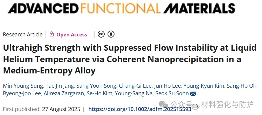 近日,韓國(guó)高麗大學(xué)Seok Su Sohn教授團(tuán)隊(duì)開發(fā)出一種新型Co36Ni46Mo11Al7中熵合金,在液氦溫區(qū)(4.2K)下展現(xiàn)出高達(dá)2.1GPa的超高強(qiáng)度和50%的延展性,成功突破了低溫合金中強(qiáng)度與穩(wěn)定性的長(zhǎng)期矛盾。目前這一研究成果已于2025年8月27日在《Advanced Functional Materials》期刊上以題為“Ultrahigh Strength with Suppressed Flow Instability at Liquid Helium Temperature via Coherent Nanoprecipitation in a Medium-Entropy Alloy”的研究論文形式公開發(fā)表。