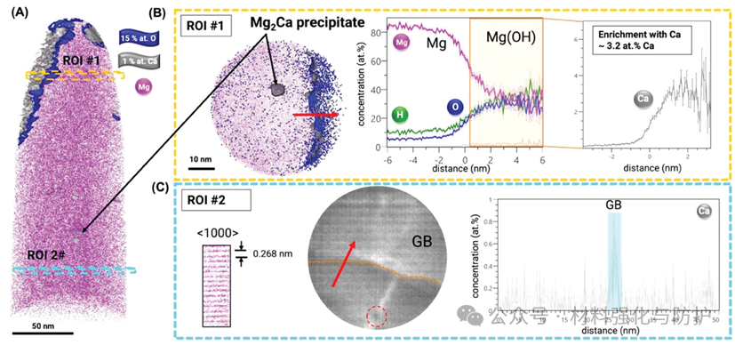 通過APT定量表征發現,在此前未被報道的Mg(OH)層中,Ca濃度高達≈3.2at.%,這一含量遠超基體平均值,說明Ca在腐蝕早期具有較強的向界面遷移趨勢,并且會傾向于摻入單氫氧化物層,而非形成獨立的CaO層,且團隊認為這一現象并非是Ca元素所獨有的,其他合金成分也可能存在類似遷移機制。