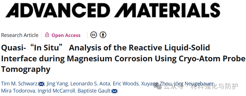 德國馬普所與英國帝國理工學院聯合在國際材料領域的權威頂級期刊《Advanced Materials》發布了題為“Quasi-In Situ Analysis of the Reactive Liquid–Solid Interface during Magnesium Corrosion Using Cryo-Atom Probe Tomography”的研究論文,團隊利用低溫原子探針斷層成像(Cryo-APT)凍結并解析鎂合金腐蝕過程中的液-固反應界面,在納米尺度上揭示出以往被忽略的瞬態中間相和元素遷移機制,為可降解金屬植入體及耐蝕合金設計提供了新的研究途徑。