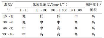 PARROT等給出了不同環境中CISCC敏感性評估的流程,見圖3,并根據不同溫度范圍、氯含量和介質狀態,將CISCC敏感性分為低、中、高三個等級,見表3;然后按照表面狀態、冷加工、是否存在點蝕或縫隙腐蝕、是否存在循環載荷、是否持續添加適當緩蝕劑等因素對敏感性分級進行優化;根據敏感性分級得到對應的裂紋擴展速率,再依據裂紋擴展速率確定相應的檢查時機。上述分級策略給出了依據溫度、氯含量、應力等關鍵因素初步掌握不銹鋼CISCC敏感性的思路,并明確了不同敏感性下對應的具體裂紋擴展速率,有利于對壁厚減薄等參數進行初步評估從而對不銹鋼部件的檢查時機進行確定。但是,該方法針對的是含氯液相環境,不是專門針對乏燃料干式貯存筒CISCC開發的敏感性評估方法,沒有完全考慮氯化物沉積、潮解及衰變熱等過程的影響。因此,無法直接將該方法用于乏燃料干式貯存筒CISCC的敏感性分級評價。