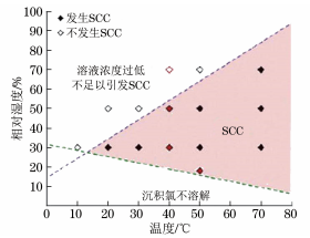 有些研究人員將氯化物的DRH視作不銹鋼發生CISCC所需的相對濕度下限,然而這一判斷準則可能不準確。許多研究人員在低于DRH的RH下觀察到了明顯的腐蝕現象。SCHINDELHOLZ等在不同 RH 的氯化鎂和合成海鹽環境中進行試驗,結果表明在RH11%氯化鎂及RH23%合成海鹽環境中,不銹鋼都發生了腐蝕。因此,從保守角度考慮不銹鋼貯存筒發生CISCC的RH下限應低于氯化物的DRH。