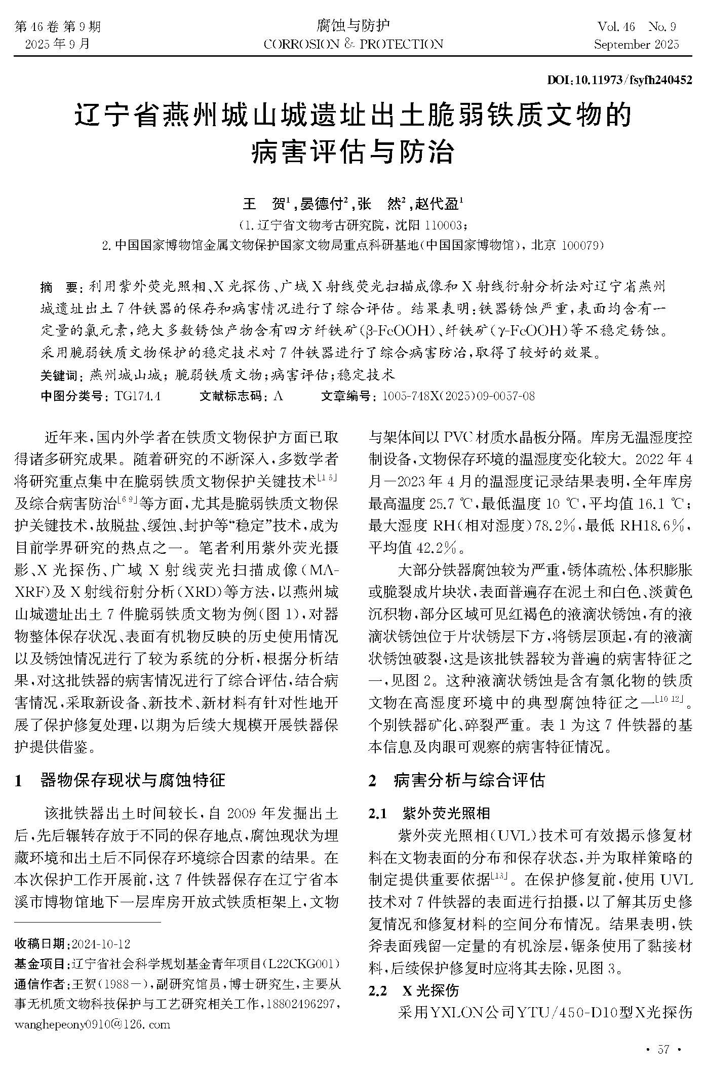 遼寧省燕州城山城遺址出土脆弱鐵質文物的病害評估與防治
