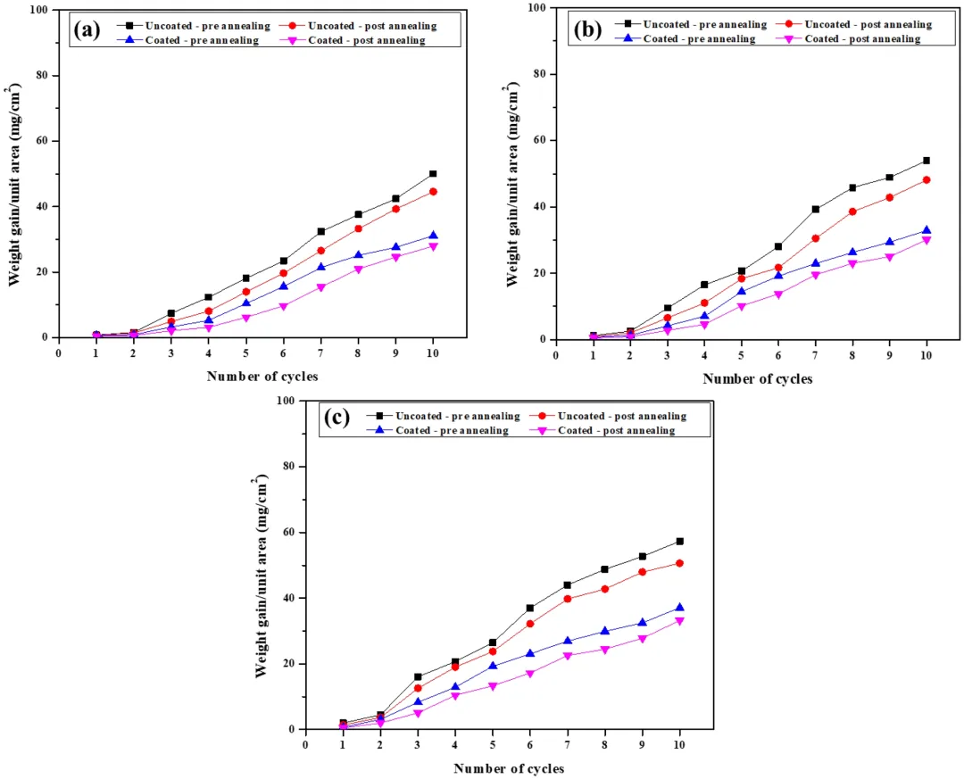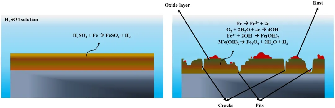 圖9a中給出了涂層樣品與未涂層在550℃退火前后的動電位極化并進行了比較。并對莫氏硬度最好的在經550℃退火處理的涂層樣品進行了腐蝕測試。在PDP曲線中觀察到的鈍化區域較大,表明在表面形成了強氧化層39。經過退火的涂層樣品的腐蝕電流密度(Icorr)和腐蝕電位(Ecorr)分別為347.19 mV和0.00374 µA。 顯然,經過退火的涂層樣品表現出更好的抗腐蝕能力。這是因為HEA涂層涂敷在在表面后能夠防止坑洞和裂紋的形成,從而起到保護作用,從而提高了耐蝕性。由于涂層HEA粉末的高熵效應有助于其在鋼基板上形成鈍化層40,且其擴散緩慢以及形成鈍化層的Al和Cr等元素的存在,形成的鈍化層具有很高的穩定性41。因此經過退火的涂層樣品與預退火后的涂層樣品相比,耐腐蝕性能有明顯提高,與未涂層樣品相比耐腐蝕能力提高更加明顯。 即使電解液中硫化物的加速作用會引起腐蝕。鈍化層也阻擋硫化物層,從而提高材料的抗腐蝕性能。極化行為和電位范圍表明氧還原是主要的陰極反應。通過退火實現的晶粒細化能以更快的速度傳導氧化膜,并更好地控制陽極反應和離子傳導42。 表2中展示了采用Stern Geary方程計算的極化電阻。從中可以看出涂層退火樣品的極化電阻較高,這進一步驗證了 PDP 曲線中的趨勢。圖9b 所示的奈奎斯特圖也支持這一結果。從相關研究中可以得到奈奎斯特圖中的電容環路更大,會提供更好的耐腐蝕性43。與其他樣品相比,涂層退火樣品的電容回線較大,表明涂層退火樣品具有出色的耐腐蝕性。在圖10中展示了涂層在H2SO4 溶液下的電化學反應機理。 表2:測試樣品的腐蝕電流密度、電位和極化電阻。 圖10.電化學腐蝕機理。 圖11.(a)SEM圖(b)元素映射(c)涂層和退火樣品的腐蝕表面的 XRD 峰。 從圖11a涂層退火樣品的腐蝕表面的SEM圖可以看到許多坑洞、裂紋和氧化層的存在。且這些坑洞都靠近氧化層,這說明了涂層與氧化層之間會發生電化學腐蝕44。這與在H2SO4溶液中形成的多孔氧化層會削弱電化學腐蝕原理一致。由圖11b的元素映射顯示可以看出材料表面形成了持久且穩定的氧化膜(圖11b)45。這種在腐蝕表面形成的氧化層能保護鋼材在強酸電解質中的嚴重腐蝕作用。這會使腐蝕表面上的硫含量降低從而減輕了硫通過破壞氧化層而造成的腐蝕。 從圖11c的XRD譜圖中可以看出,Co(OH)2、Fe(OH)3 和 Cr(OH)3的形成有助于鈍化層的形成。從圖12中的涂層和退火樣品的腐蝕表面的橫截面可以看出表面出現了凹坑和裂紋。AlCoCrFeNi HEA涂層旁邊的氧化層的形成進一步提高了材料的耐腐蝕能力。最后在表3中總結了涂層表面及樣品上形成的主要腐蝕產物。 圖12.涂層和退火樣品的腐蝕表面的橫截面。 表3.電化學腐蝕試驗腐蝕產物的元素組成。 圖13中為經過550℃退火的涂層樣品在900℃的高溫下進行的熱腐蝕分析測試圖。重量增加與循環數的關系趨勢表明,在所有三種鹽混合物下帶有HEA涂層且經過退火的樣品都表現出最小的重量增加。整體上看,由于鹽混合物B和C的腐蝕條件更為苛刻,因此它們的重量增加均略高于混合物A。具體來看,在A、B、C三種條件下經過退火操作的涂層樣品的重量增加比未經過退火操作的涂層樣品分別減少了10.1%、8.49%和10.36%,比未施加HEA涂層的基材分別減少了44.09%、44.25%和42.09%。 從圖14的熱腐蝕過程圖看,熱腐蝕過程包括三個階段:潛伏期、啟動期和擴散期。潛伏期一般發生在施加鹽混合物不久,此時會引發材料表面氧化。一般認為,這時會產生穩定的氧化物,并不會降低樣品的耐腐蝕性能反而起到保護的作用。接著進入啟動期,此時混合物鹽開始發揮作用且達到所需要的溫度。 在這一階段時,在潛伏期中產生的保護性氧化層已經嵌入涂層表面。此時由于溫度進一步升高,會促使活性硫化物層的形成,從而對這層保護性氧化層造成破壞46。且內部形成的硫化物會選擇性地消耗和溶解氧化層以至于樣品涂層表面直接暴露于腐蝕環境中,這都會導致耐腐蝕性能的降低47。最后的擴散階段包括沿基材的表面氧化皮與熔融鹽之間的相互作用。這種機制稱為熔化,由于鋁和鉻擴散系數的差異,它們會向外擴散,這會導致氯離子進入合金內部從而使腐蝕擴散。這些氯離子會進一步從合金中擴散出鋁或鉻,并產生高度揮發性的氣態氯化物且在材料內部形成空隙,從而使機械性能大大降低。這種擴散會導致氧化物的快速轉化,使其發生更多的氧化反應,導致腐蝕性能的進一步下降。 圖 13. (a) 鹽混合物 A、(b) 鹽混合物 B、(c) 鹽混合物 C 的熱腐蝕圖。 圖14. 熱腐蝕機理 圖 15. 混合物 A 下熱腐蝕表面的 SEM 圖像:(a) 未涂層樣品 (b) 未涂層樣品退火后 (c) 涂層樣品 (d) 涂層樣品退火后 (e) 涂層樣品退火后橫截面。 在圖15、16和17中展示了所有條件下腐蝕樣品的表面形態。在圖18的SEM圖像顯示出了腐蝕過程中坑洞、裂紋、剝落和孔隙的形成。從圖19的XRD圖中驗證了Fe3O4、Cr2O3、Cr2SO4、VO4、Na3VO4、NaVO3和Ni3(VO4)2等腐蝕產物的形成。這說明涂在表面的鹽在暴露于高溫時會在表面形成熔融沉積物。這些熔融的沉積物將破壞形成的保護性氧化層,并滲透到金屬的核心。而與其他樣品相比,經退火的涂層樣品由于噴涂了HEA層從而提供了更好的熱穩定性和耐蝕性,因此在涂層表面上看到的孔和坑洞較小。而形成的硫酸鹽和釩酸鹽的熔點較低,會進一步引發熔融反應從而加速腐蝕。這些熔融反