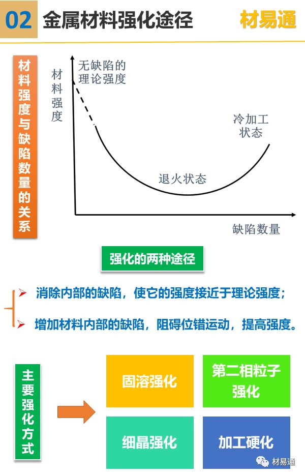 金屬材料的強化途徑不外兩個,一是提高合金的原子間結合力,提高其理論強度,并制得無缺陷的完整晶體,如晶須。已知鐵的 晶須的強度接近理論值,可以認為這是因為晶須中沒有位錯,或者只包含少量在形變過程中不能增殖的位錯。可惜當晶須的直徑較大時,強度會急劇下降。另一強化途徑是向晶體內引入大量晶體缺陷,如位錯、點缺陷、異類原子、晶界、高度彌散的質點或不均勻性(如偏聚)等,這些缺陷阻礙位錯運動,也會明顯地提高金屬強度。事實證明,這是提高金屬強度最有效的途徑。對工程材料來說,一般是通過綜合的強化效應以達到較好的綜合性能。
