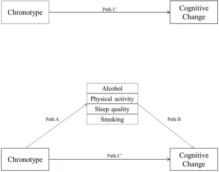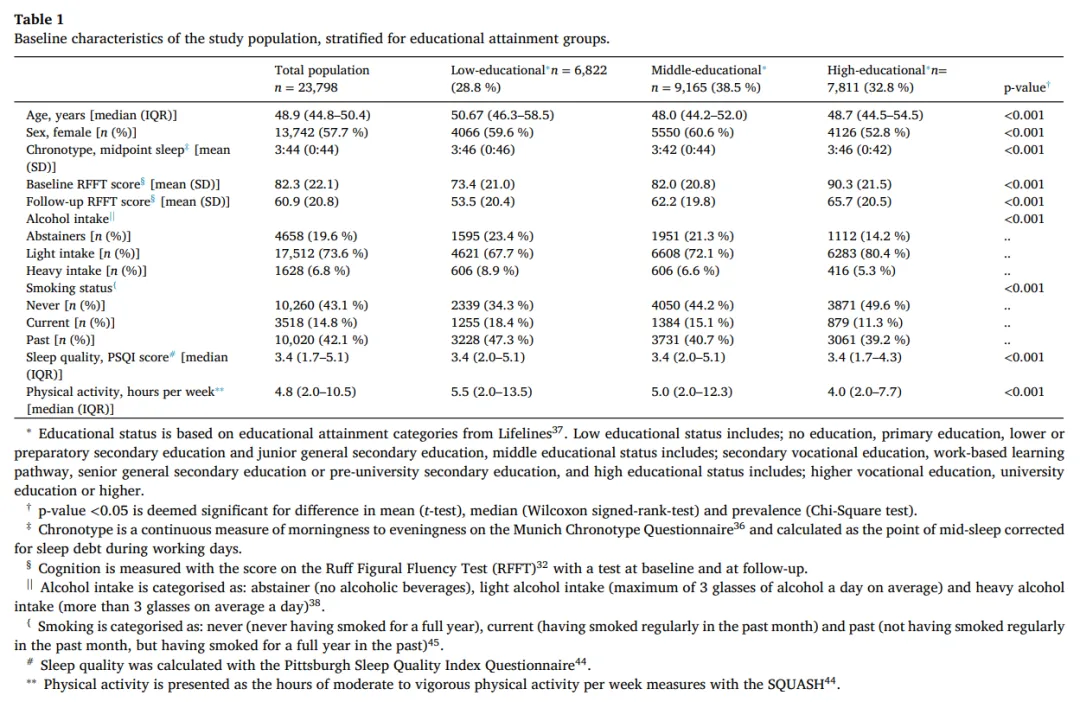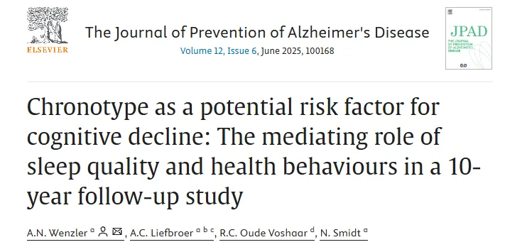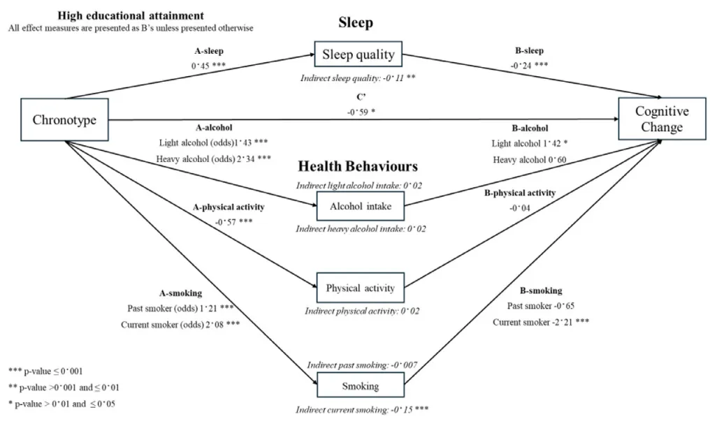 在中老年高教育人群中,較晚時型與更明顯的認知下降相關。其中約13.2%和16.8%的關聯分別由睡眠質量差與當前吸煙所中介。