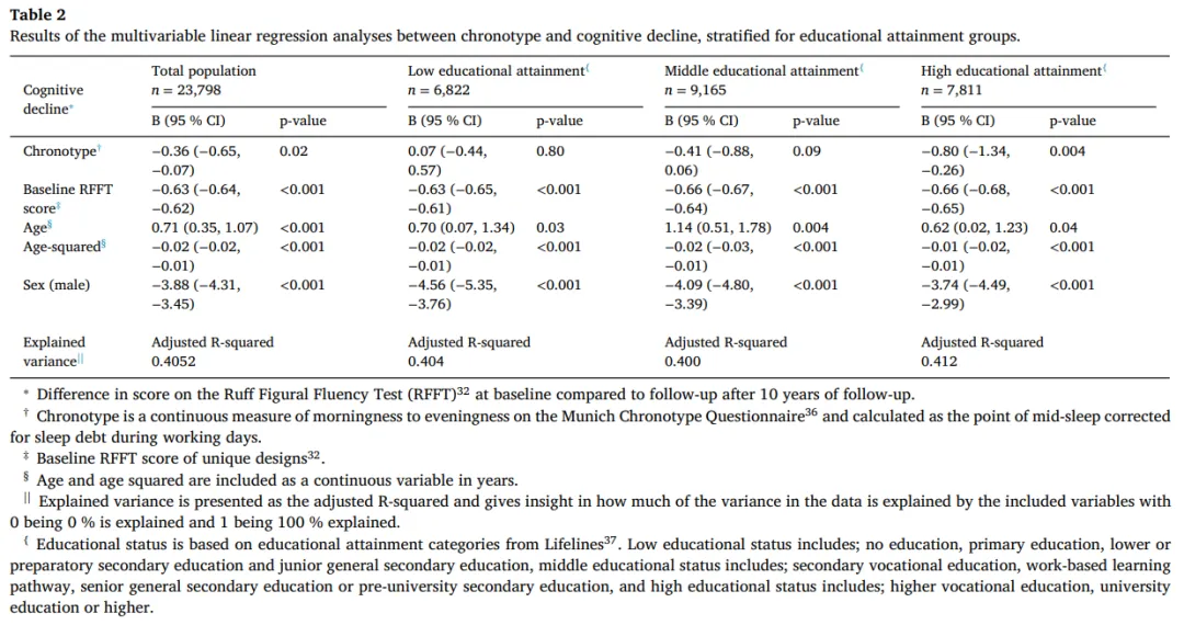表2中顯示了變量相關性。該研究證實,長期晚睡,會讓認知更容易下降。