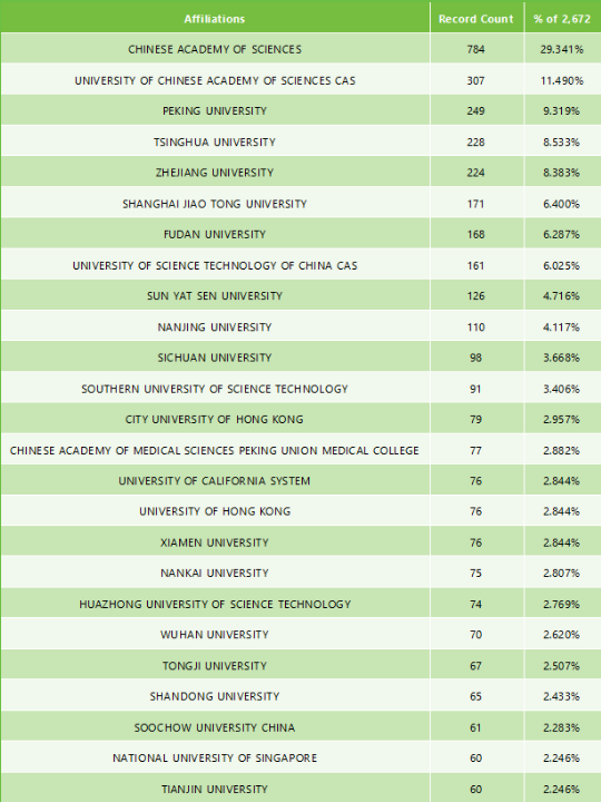 排名第一的是中國科學院(CHINESE ACADEMY OF SCIENCES),發表了784篇;