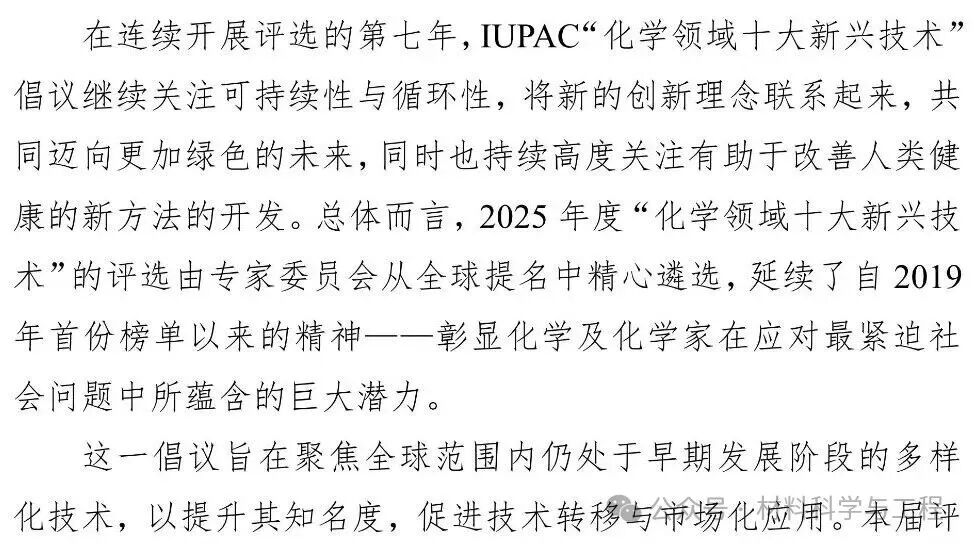10月27日,在2025年世界科技與發(fā)展論壇開幕式期間,國際純粹與應(yīng)用化學(xué)聯(lián)合會(huì)(IUPAC)正式發(fā)布了2025年度IUPAC化學(xué)領(lǐng)域十大新興技術(shù)。