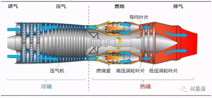 高溫合金從誕生起就應用于航空發(fā)動機,在現(xiàn)代航空發(fā)動機中,高溫合金材料主要用于四大熱端部件:燃燒室、導向室、渦輪葉片和渦輪盤,此外還用于機匣、環(huán)件、加力燃燒室和尾噴口等部件。