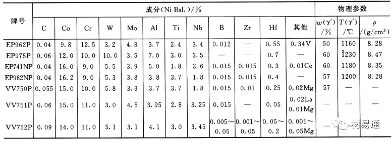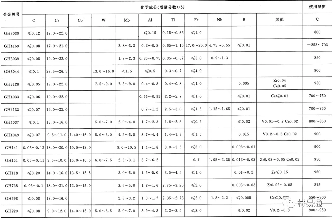 中國常用鎳基變形高溫合金的牌號、化學成分及使用溫度