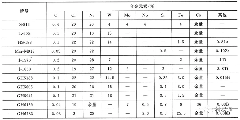 部分鈷基變形高溫合金的化學成分 (質量分數(shù))