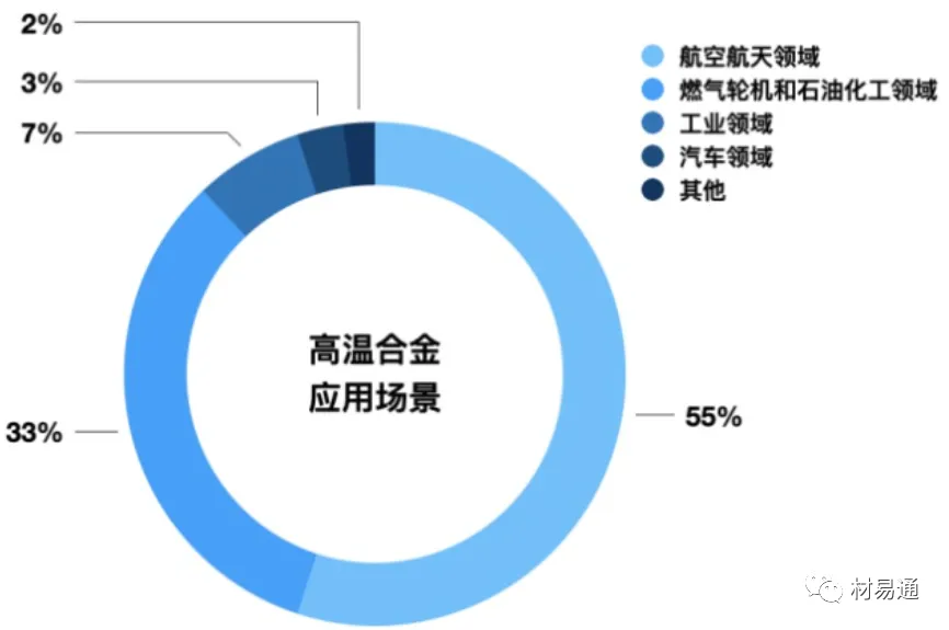 高溫合金第一大應用場景是航空航天領域,需求份額占比為 55%。高溫合金材料是航天航空發(fā)動機的重要制造原材料,主要應用于發(fā)動機的燃燒室、導向器、渦輪葉片、渦輪盤、尾噴口及機匣等部件。其次,高溫合金具備耐高溫、耐腐蝕等優(yōu)良性能,也被廣泛應用于燃氣輪機、石油化工、工業(yè)和汽車領域等場景。