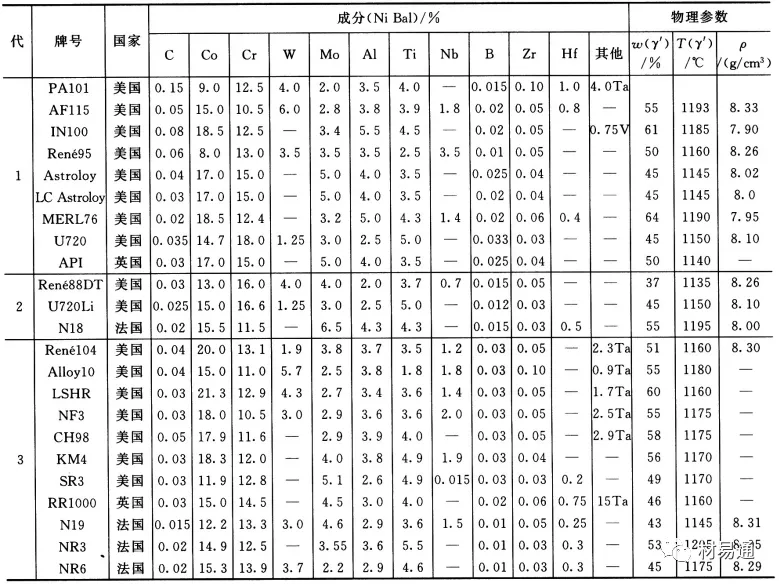 部分美國、歐洲的粉末冶金高溫合金的化學成分與性能