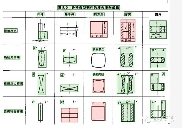 表5.3為各種典型鋼件的淬火變形規(guī)律。